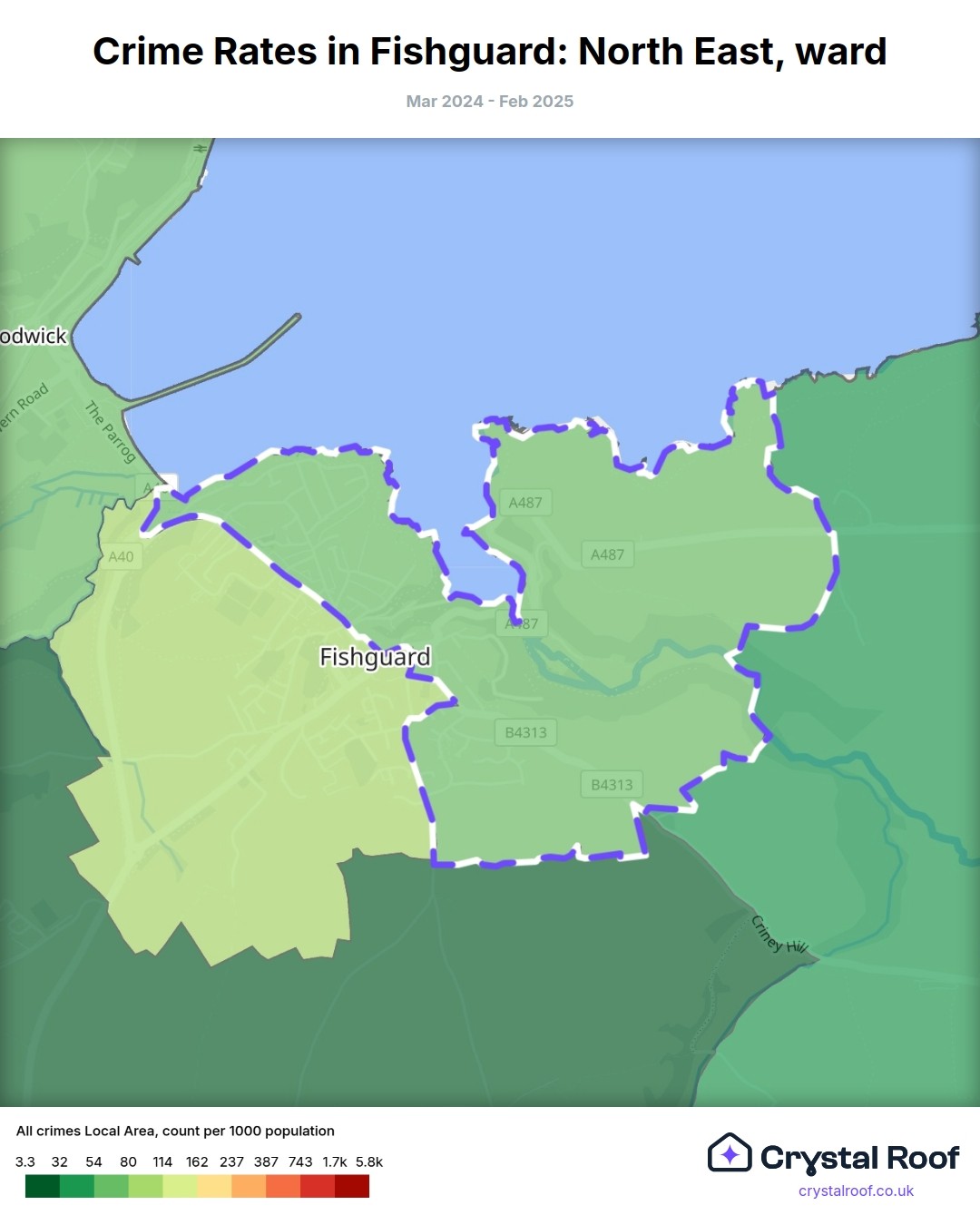 Fishguard: North East (ward) is located within Pembrokeshire (borough). Annual total crime rate in Pembrokeshire (borough) is 85 crimes per thousand resident population, which can be rated as 3 out of 10 or low crime level compared to other local authority districts in England and Wales.