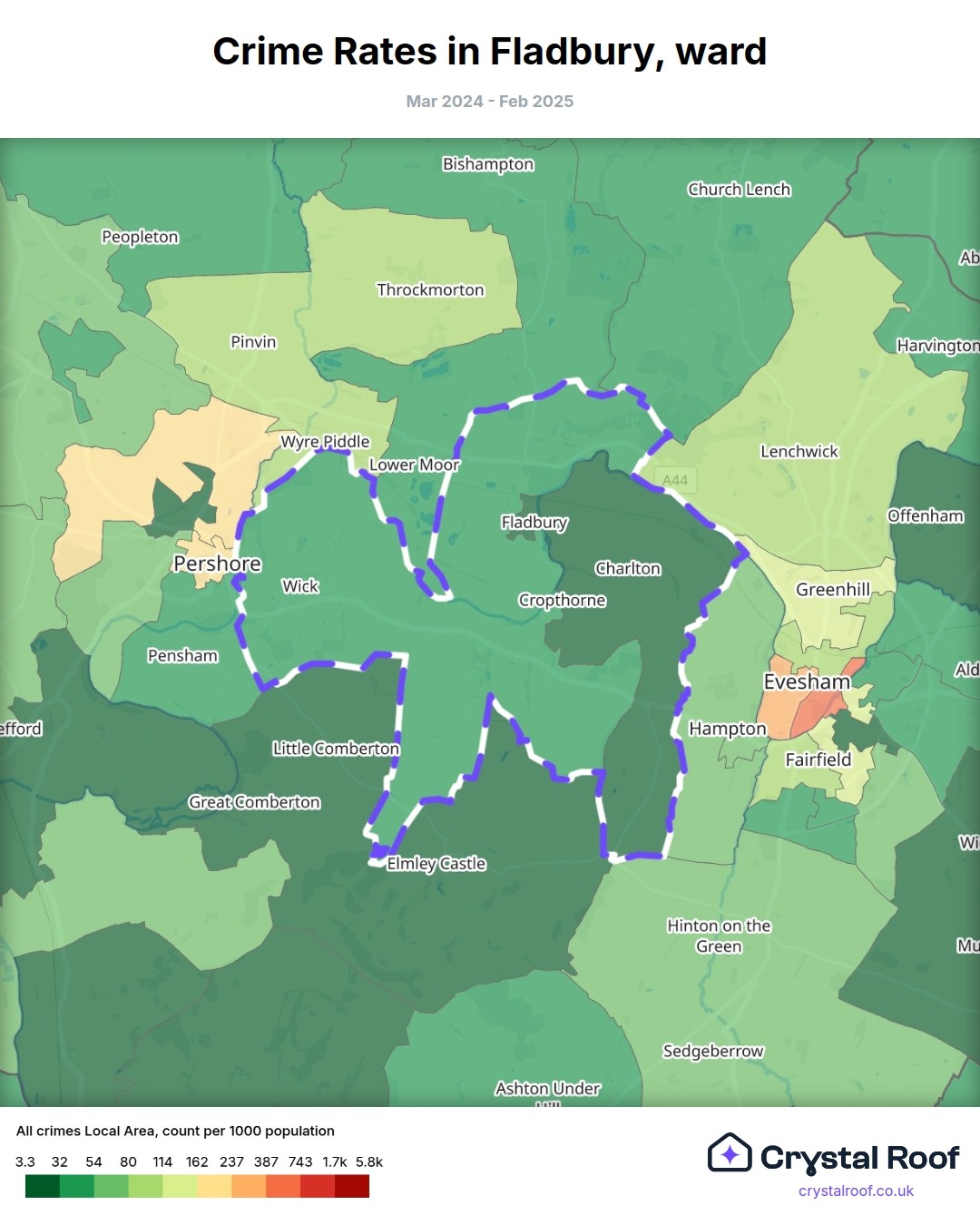Fladbury, (ward) includes areas with the following crime ratings (see map):