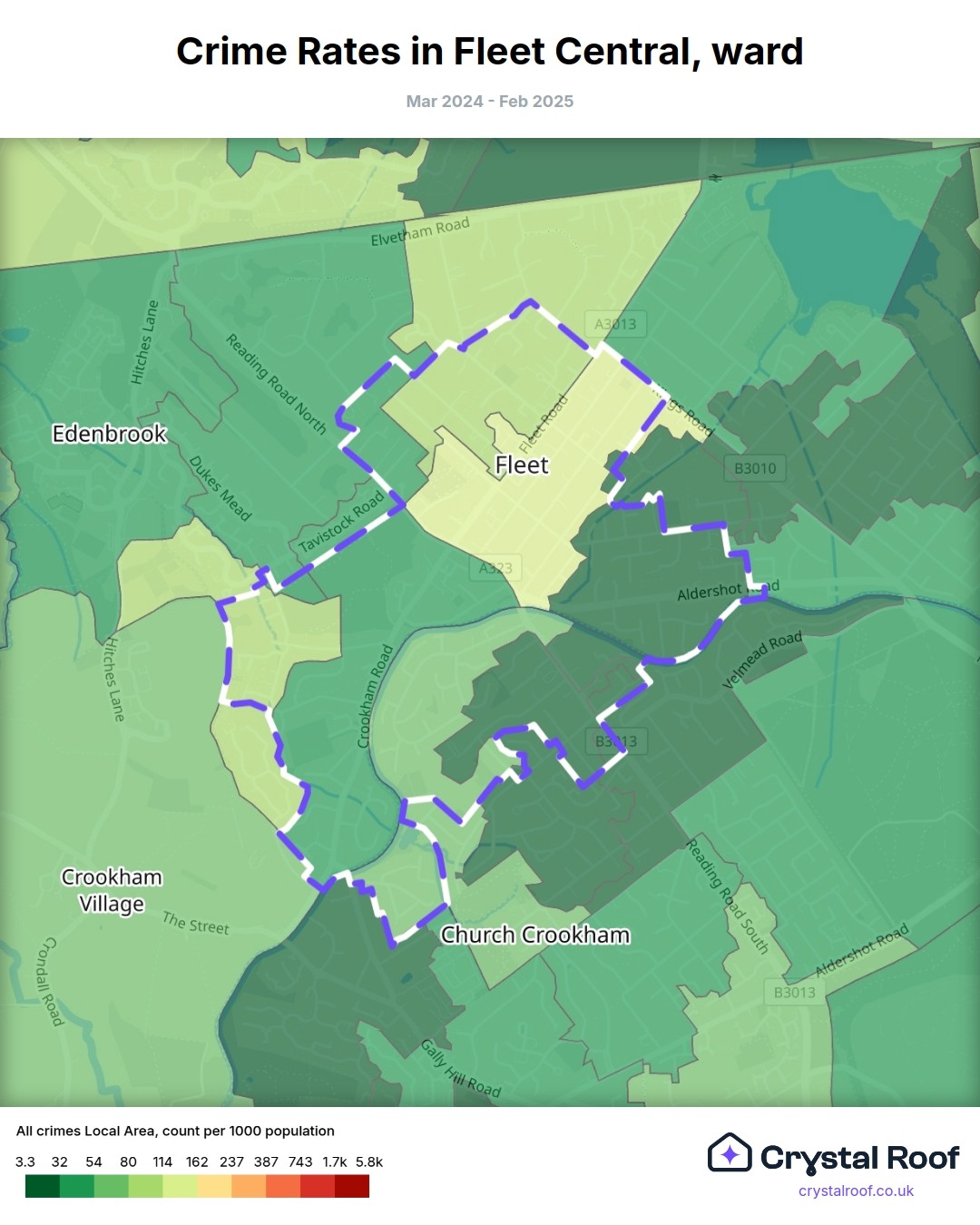The figures in grey indicate the relative ratings of Fleet Central (ward) for a specific crime type compared to other wards in England and Wales.