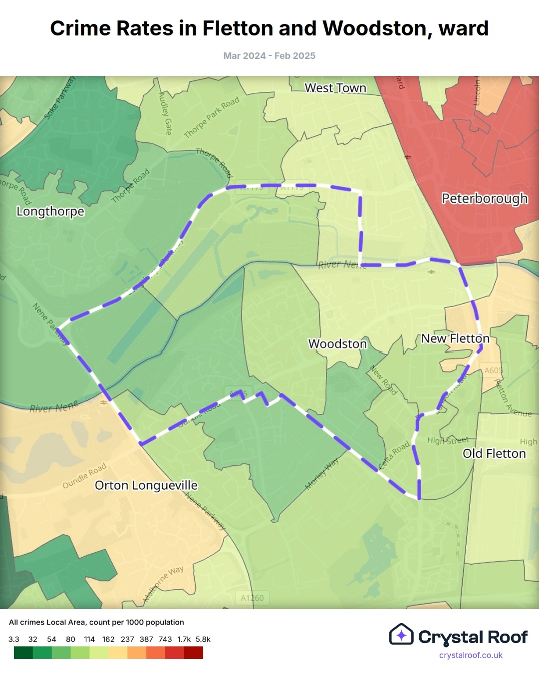 Fletton and Woodston, (ward) includes areas with the following crime ratings (see map):