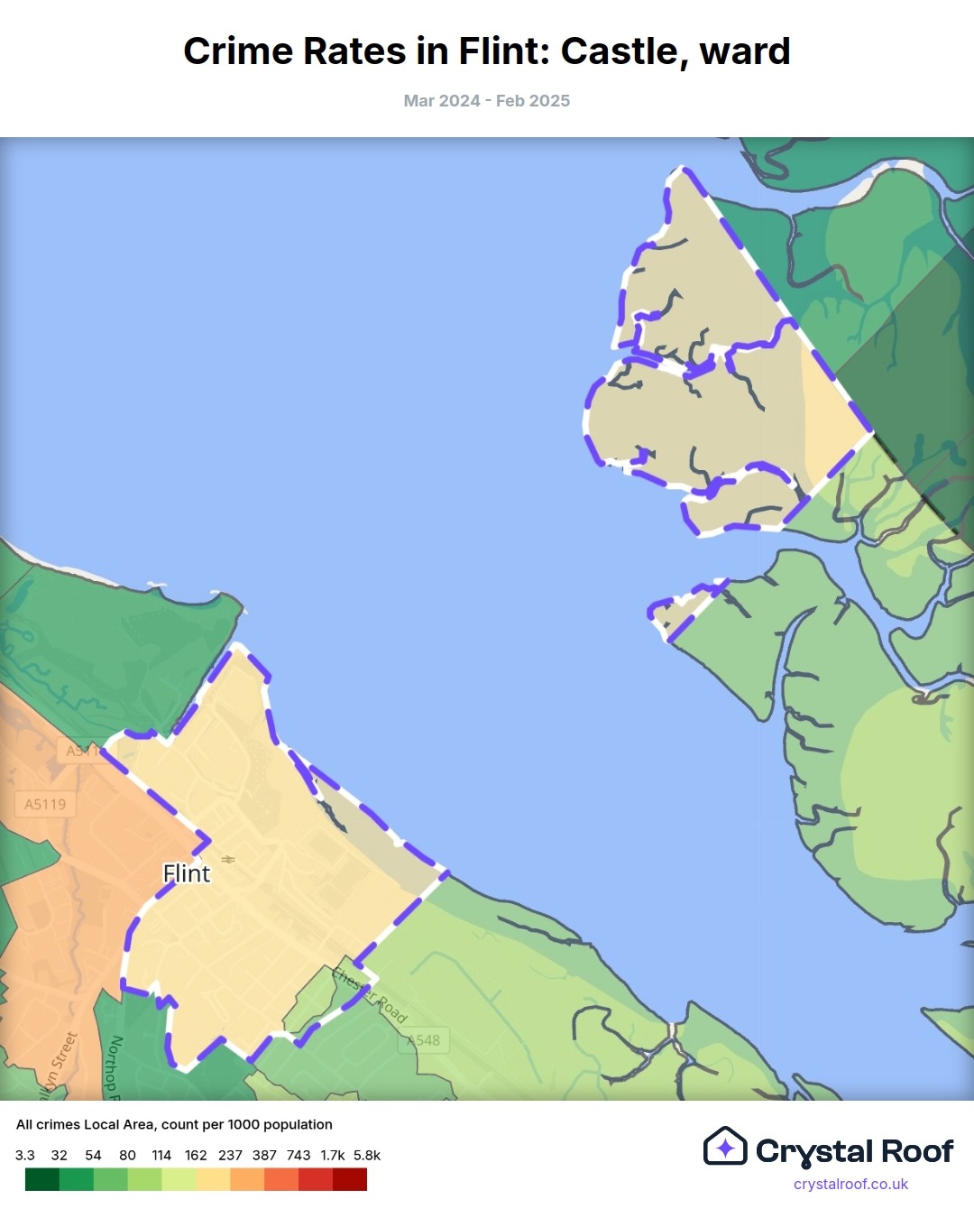 Flint: Castle, (ward) includes areas with the following crime ratings (see map):