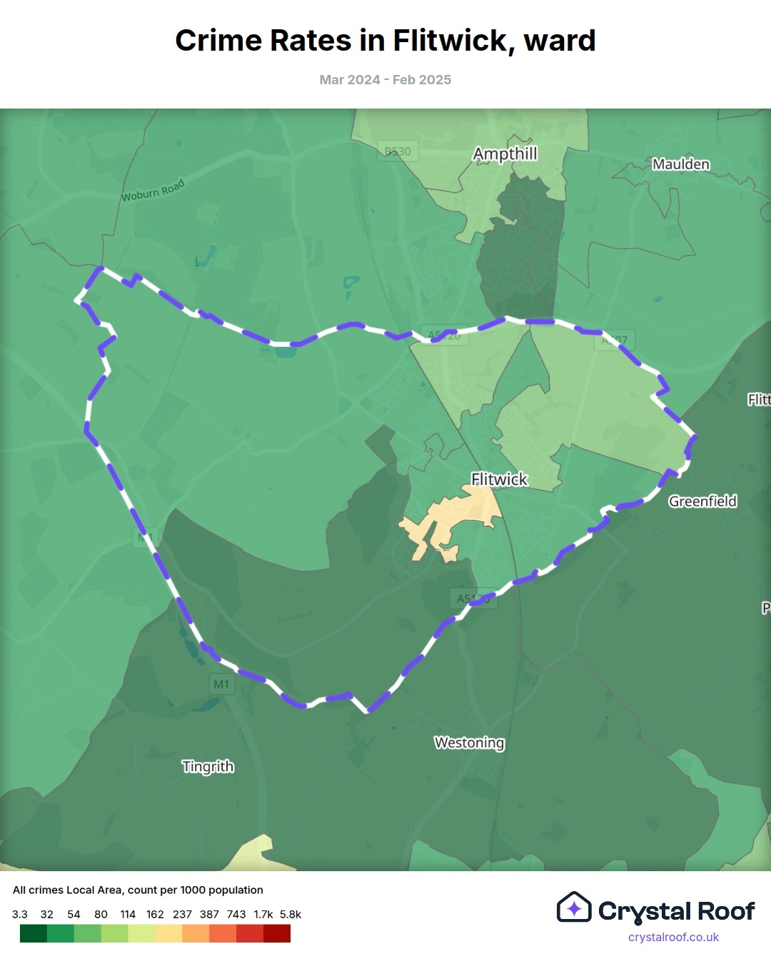The figures in grey indicate the relative ratings of Flitwick (ward) for a specific crime type compared to other wards in England and Wales.