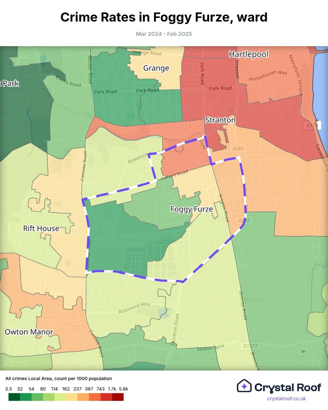 Foggy Furze (ward) is located within Hartlepool (borough). Annual total crime rate in Hartlepool (borough) is 171 crimes per thousand resident population, which can be rated as 8 out of 10 or high crime level compared to other local authority districts in England and Wales.