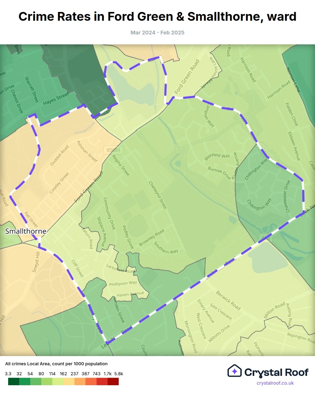 Ford Green & Smallthorne, (ward) includes areas with the following crime ratings (see map):