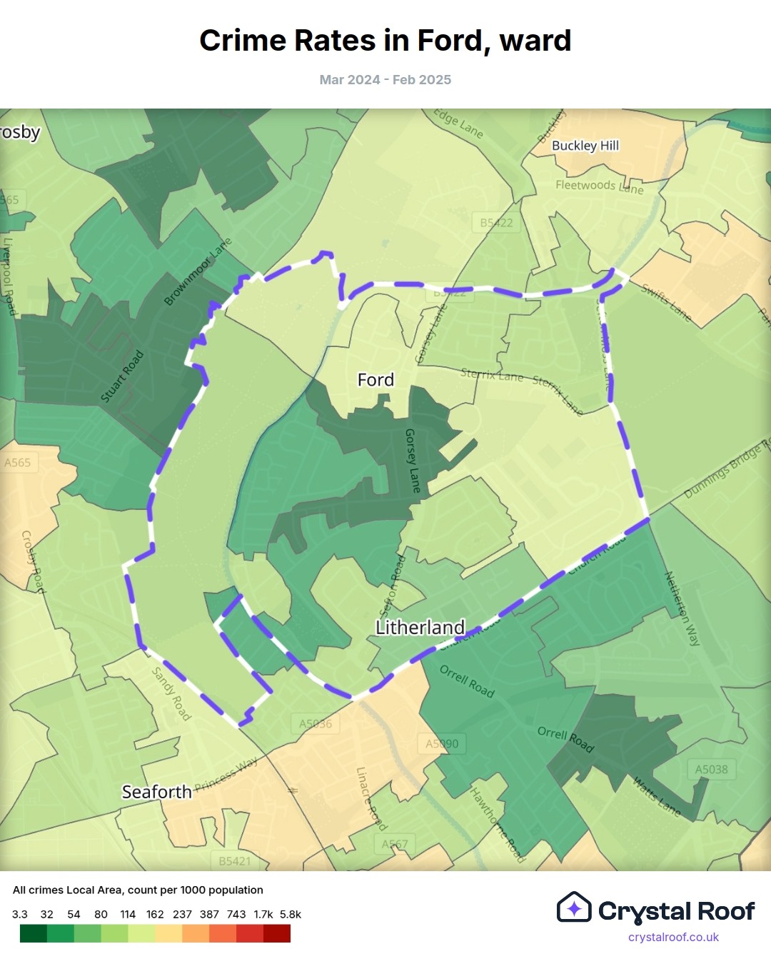 Ford (ward) is located within Sefton (borough). Annual total crime rate in Sefton (borough) is 86.3 crimes per thousand resident population, which can be rated as 4 out of 10 or low crime level compared to other local authority districts in England and Wales.