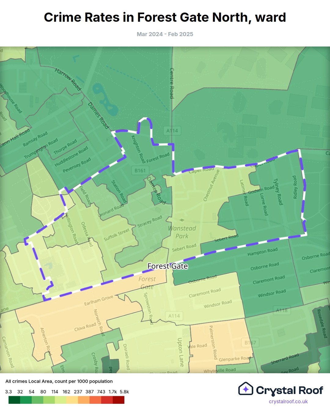 Forest Gate North, (ward) includes areas with the following crime ratings (see map):