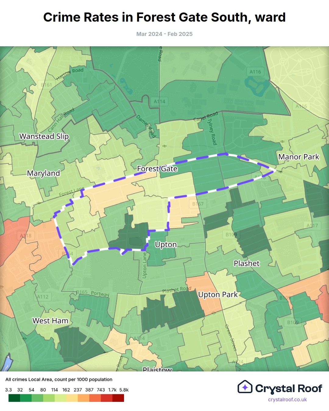 Forest Gate South, (ward) includes areas with the following crime ratings (see map):