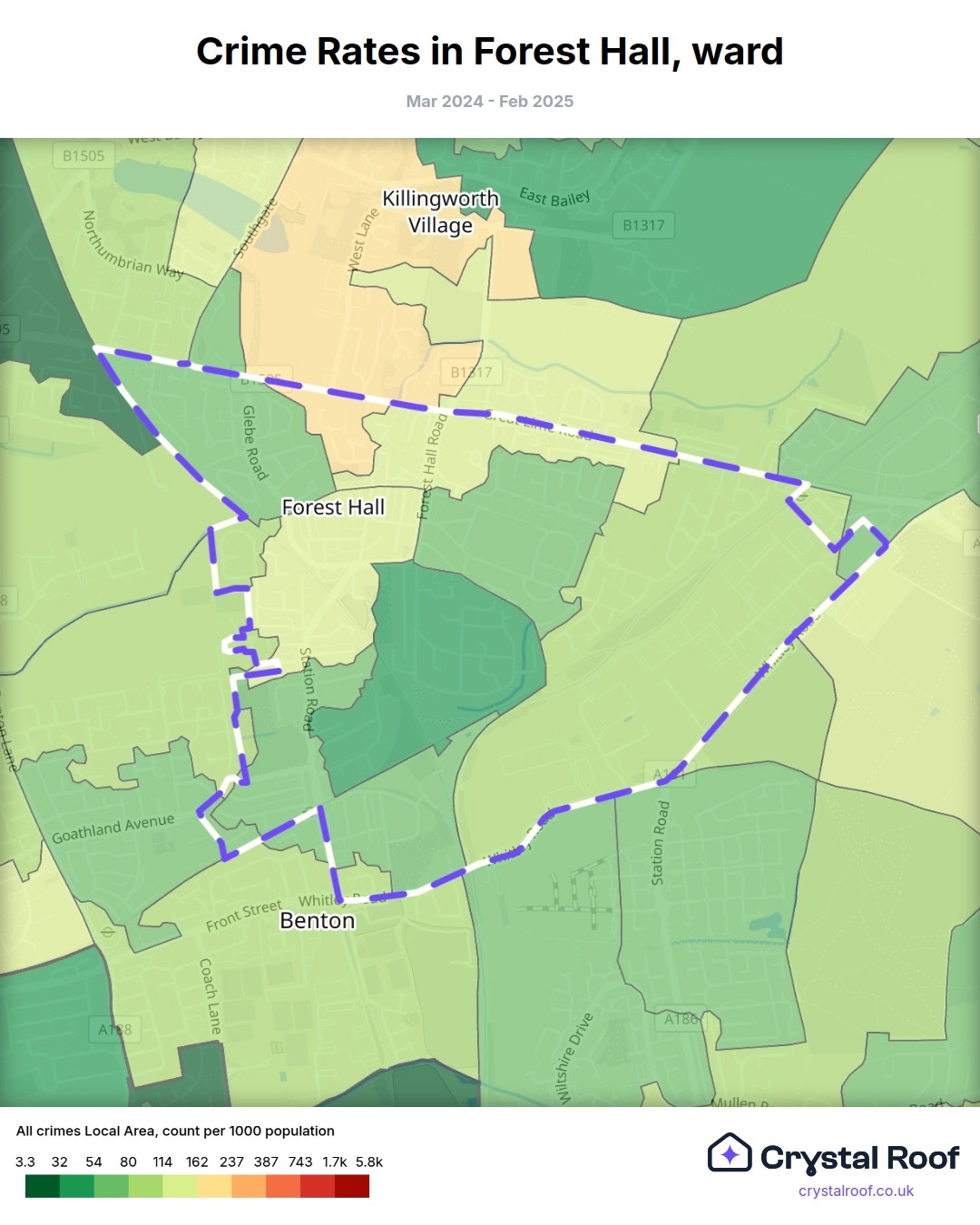 Forest Hall, (ward) includes areas with the following crime ratings (see map):
