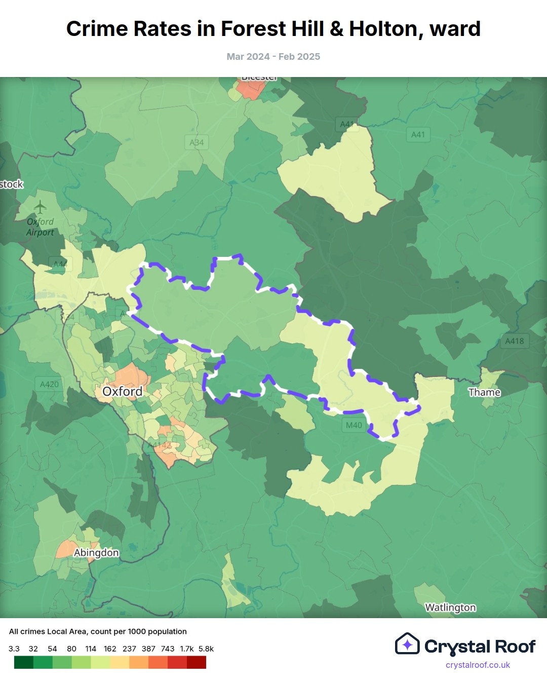 Forest Hill & Holton (ward) is located within South Oxfordshire (borough). Annual total crime rate in South Oxfordshire (borough) is 49.6 crimes per thousand resident population, which can be rated as 1 out of 10 or low crime level compared to other local authority districts in England and Wales.