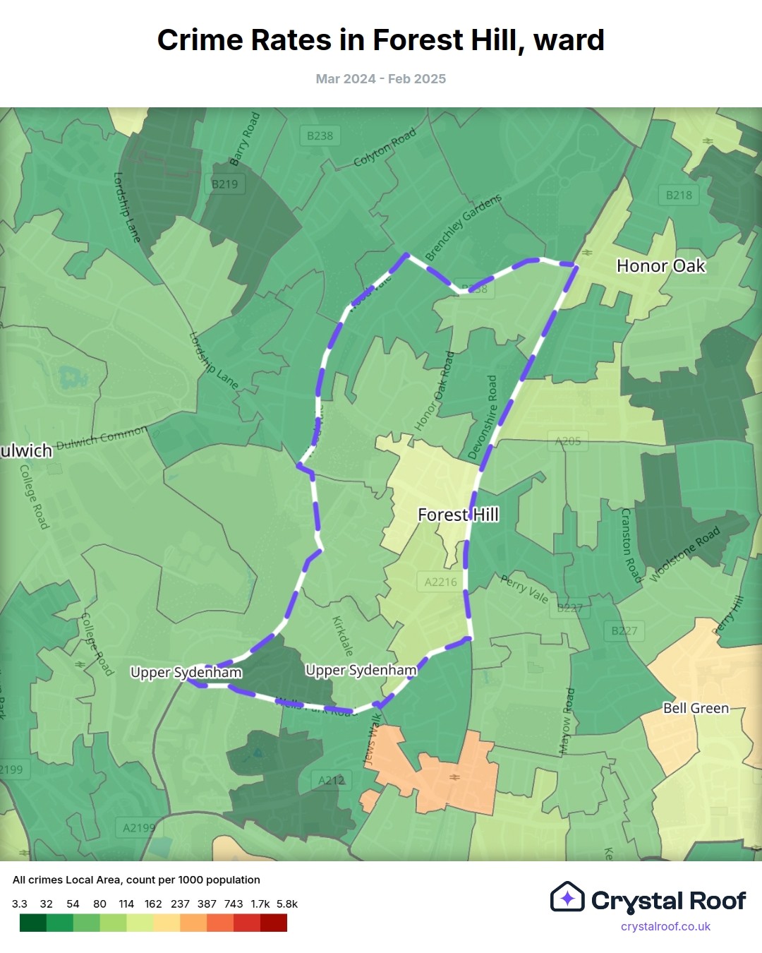 Forest Hill, (ward) includes areas with the following crime ratings (see map):