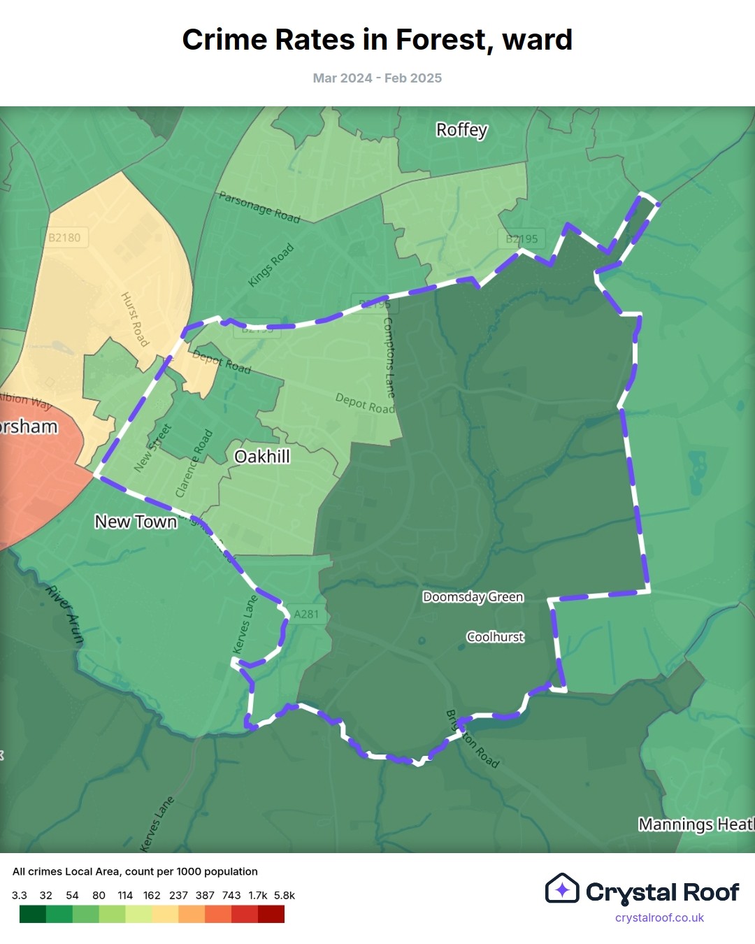 Forest (ward) is located within Horsham (borough). Annual total crime rate in Horsham (borough) is 54.1 crimes per thousand resident population, which can be rated as 1 out of 10 or low crime level compared to other local authority districts in England and Wales.