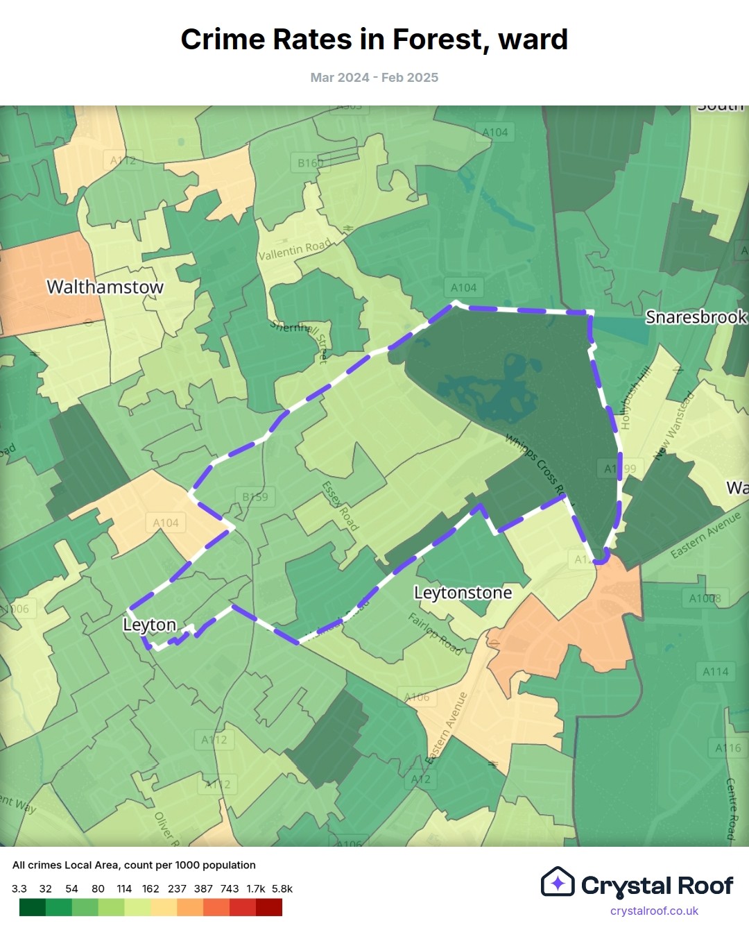 Forest (ward) is located within Waltham Forest (borough). Annual total crime rate in Waltham Forest (borough) is 110 crimes per thousand resident population, which can be rated as 5 out of 10 or medium crime level compared to other local authority districts in England and Wales.
