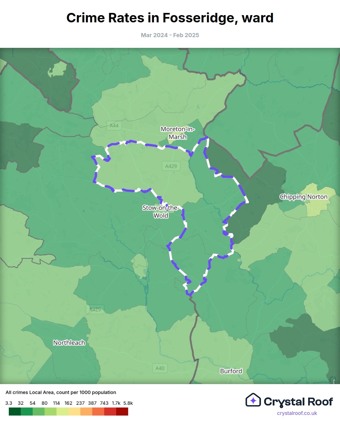 Fosseridge (ward) is located within Cotswold (borough). Annual total crime rate in Cotswold (borough) is 58.6 crimes per thousand resident population, which can be rated as 2 out of 10 or low crime level compared to other local authority districts in England and Wales.