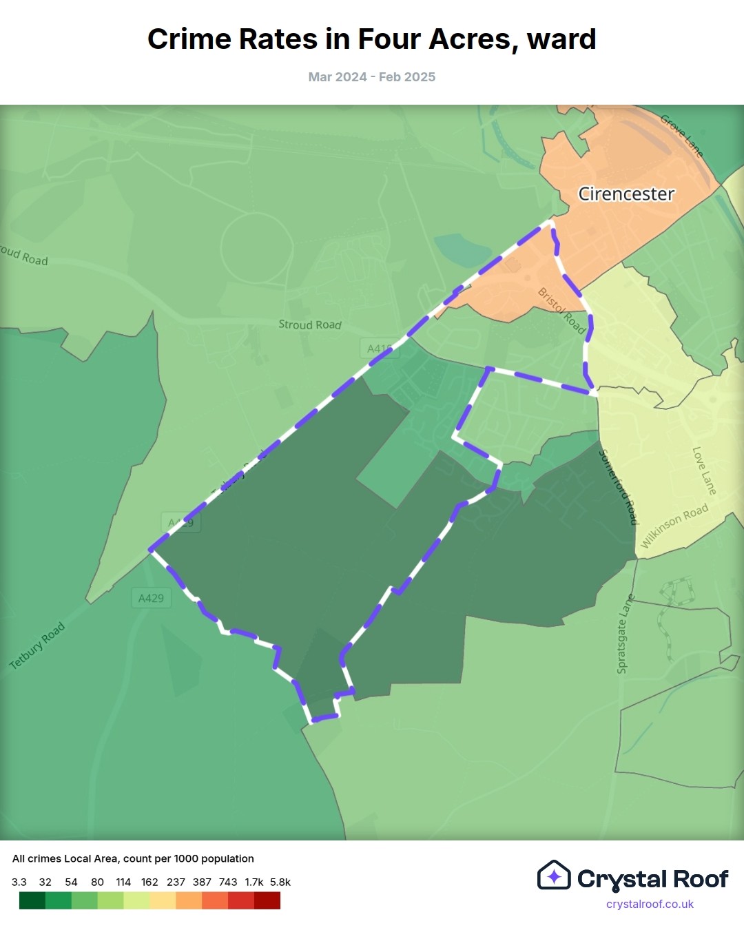 Four Acres (ward) is located within Cotswold (borough). Annual total crime rate in Cotswold (borough) is 58.6 crimes per thousand resident population, which can be rated as 2 out of 10 or low crime level compared to other local authority districts in England and Wales.