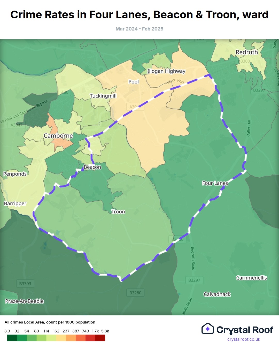 Four Lanes, Beacon & Troon, (ward) includes areas with the following crime ratings (see map):