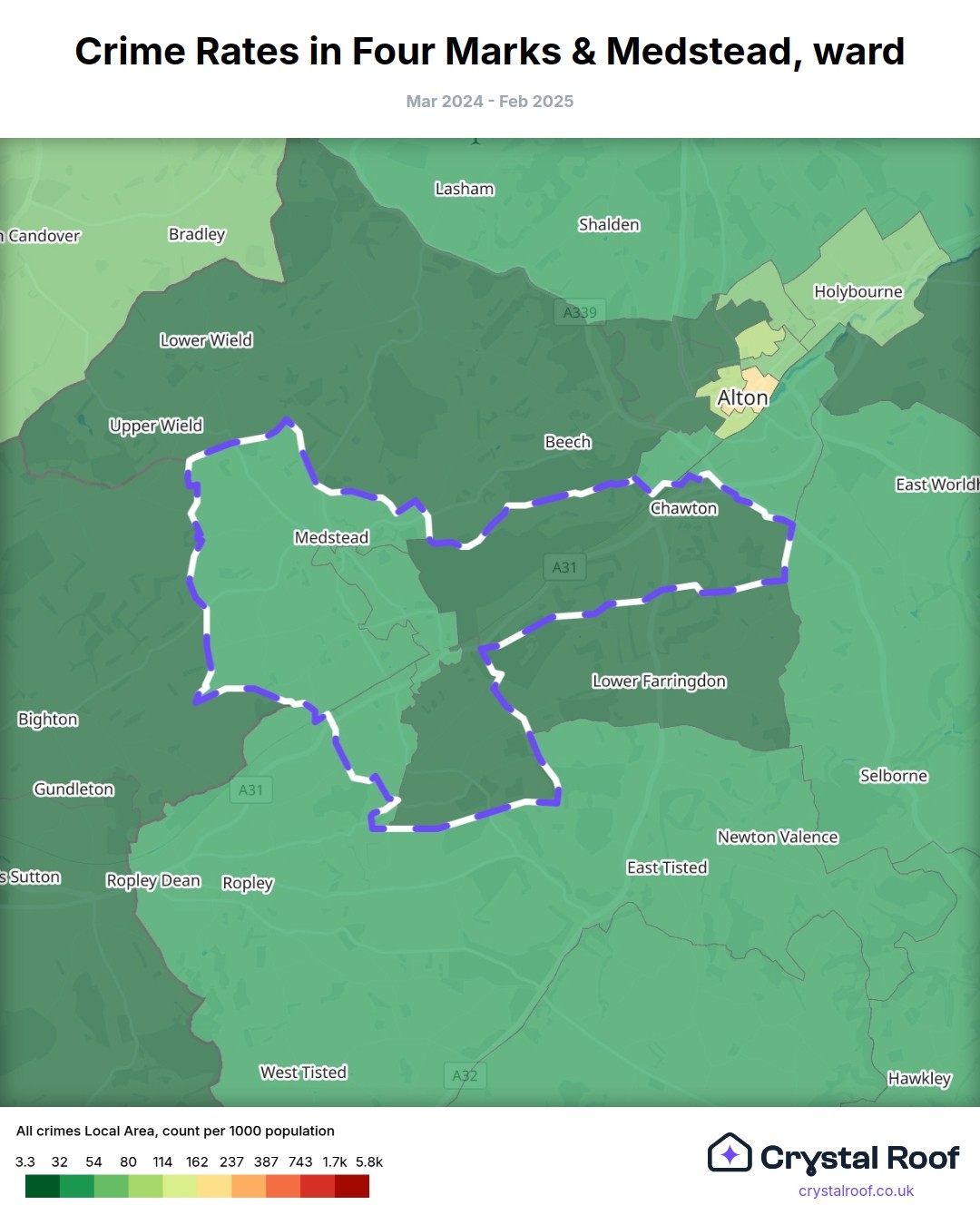 The figures in grey indicate the relative ratings of Four Marks & Medstead (ward) for a specific crime type compared to other wards in England and Wales.