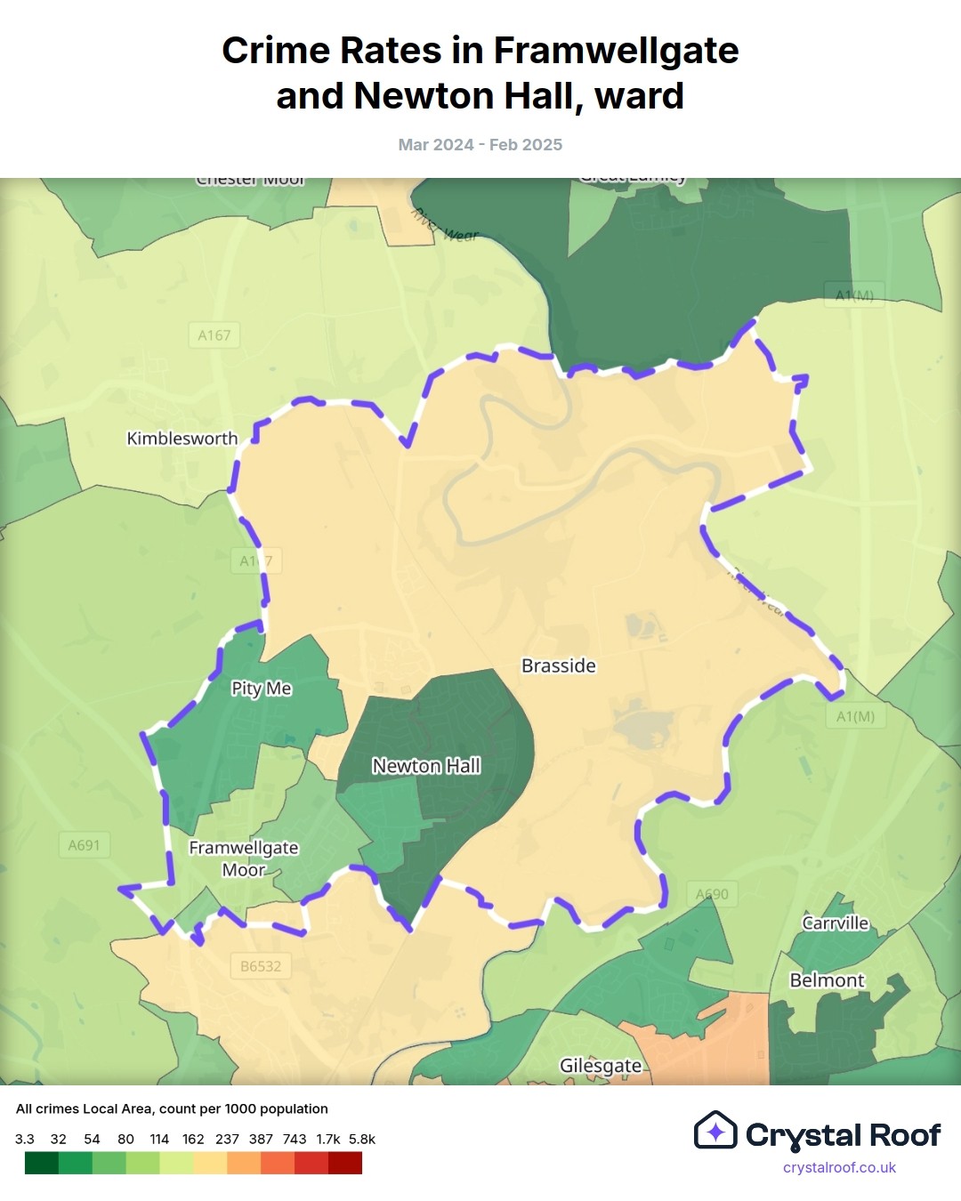 Framwellgate & Newton Hall, (ward) includes areas with the following crime ratings (see map):