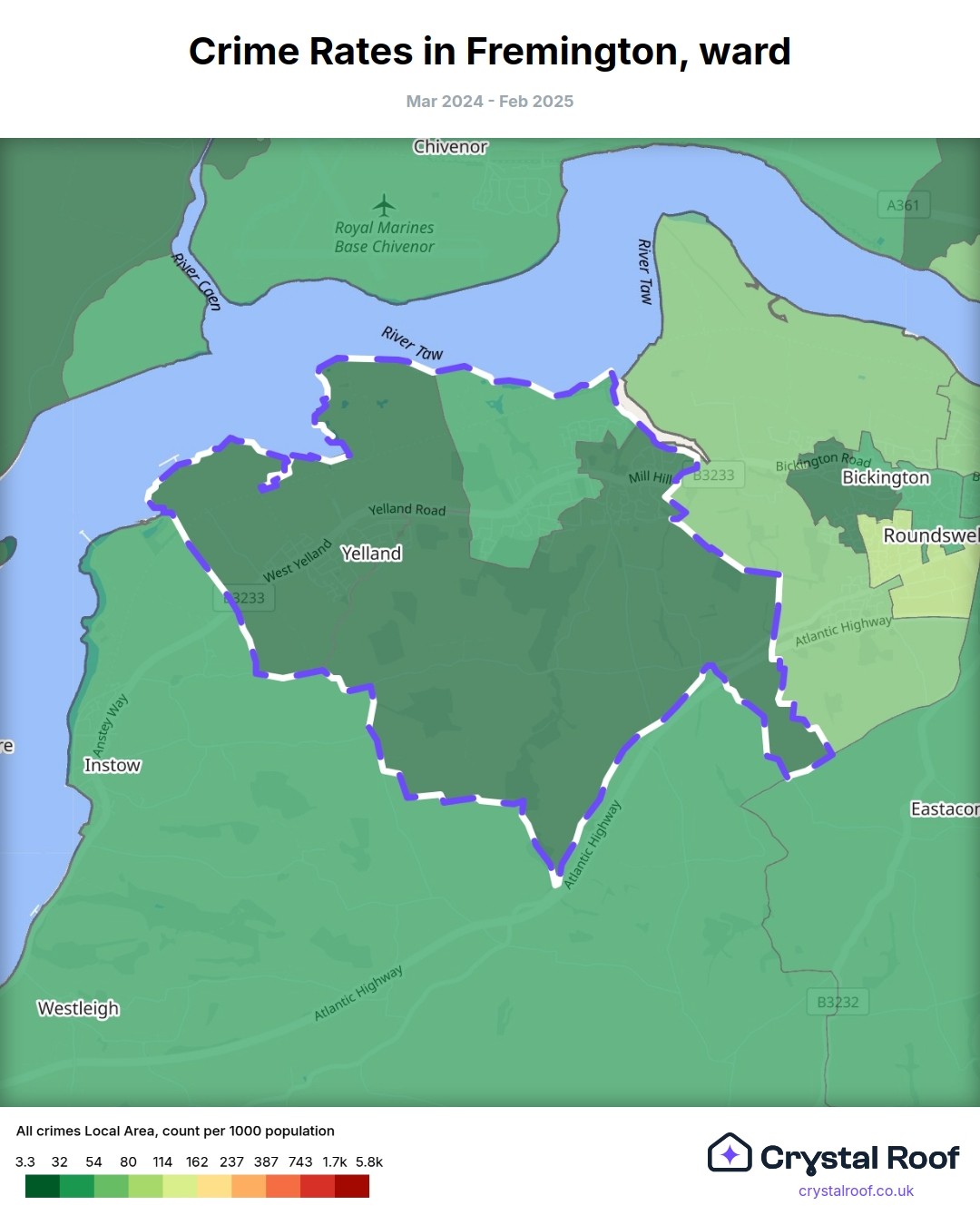 The figures in grey indicate the relative ratings of Fremington (ward) for a specific crime type compared to other wards in England and Wales.