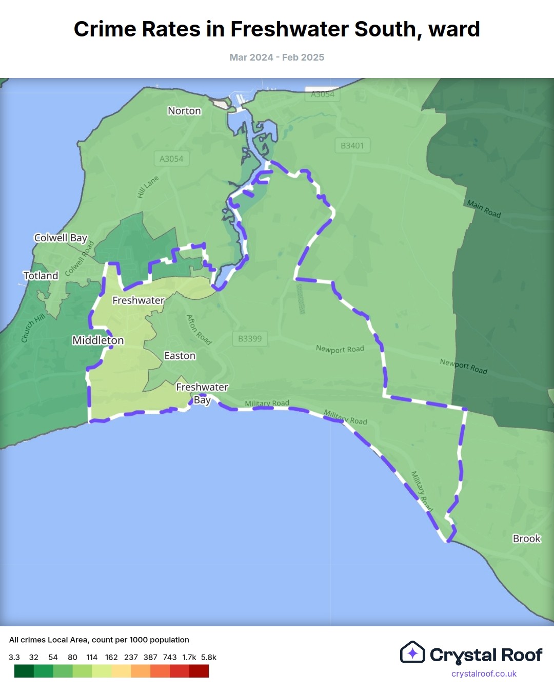 Freshwater South (ward) is located within Isle of Wight (borough). Annual total crime rate in Isle of Wight (borough) is 84.9 crimes per thousand resident population, which can be rated as 3 out of 10 or low crime level compared to other local authority districts in England and Wales.