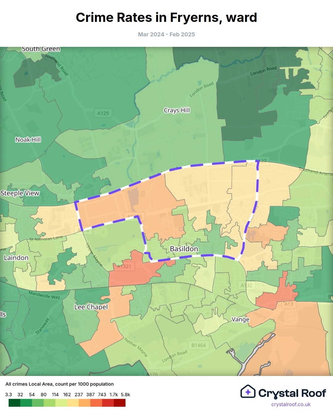 Fryerns, (ward) includes areas with the following crime ratings (see map):