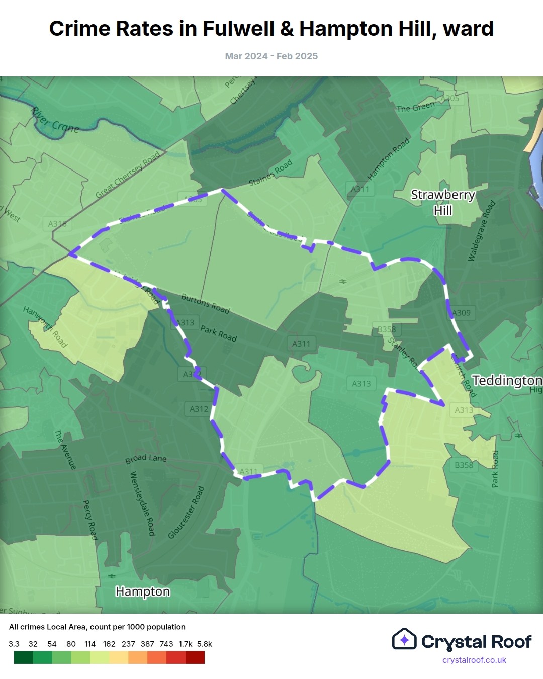 Fulwell & Hampton Hill, (ward) includes areas with the following crime ratings (see map):
