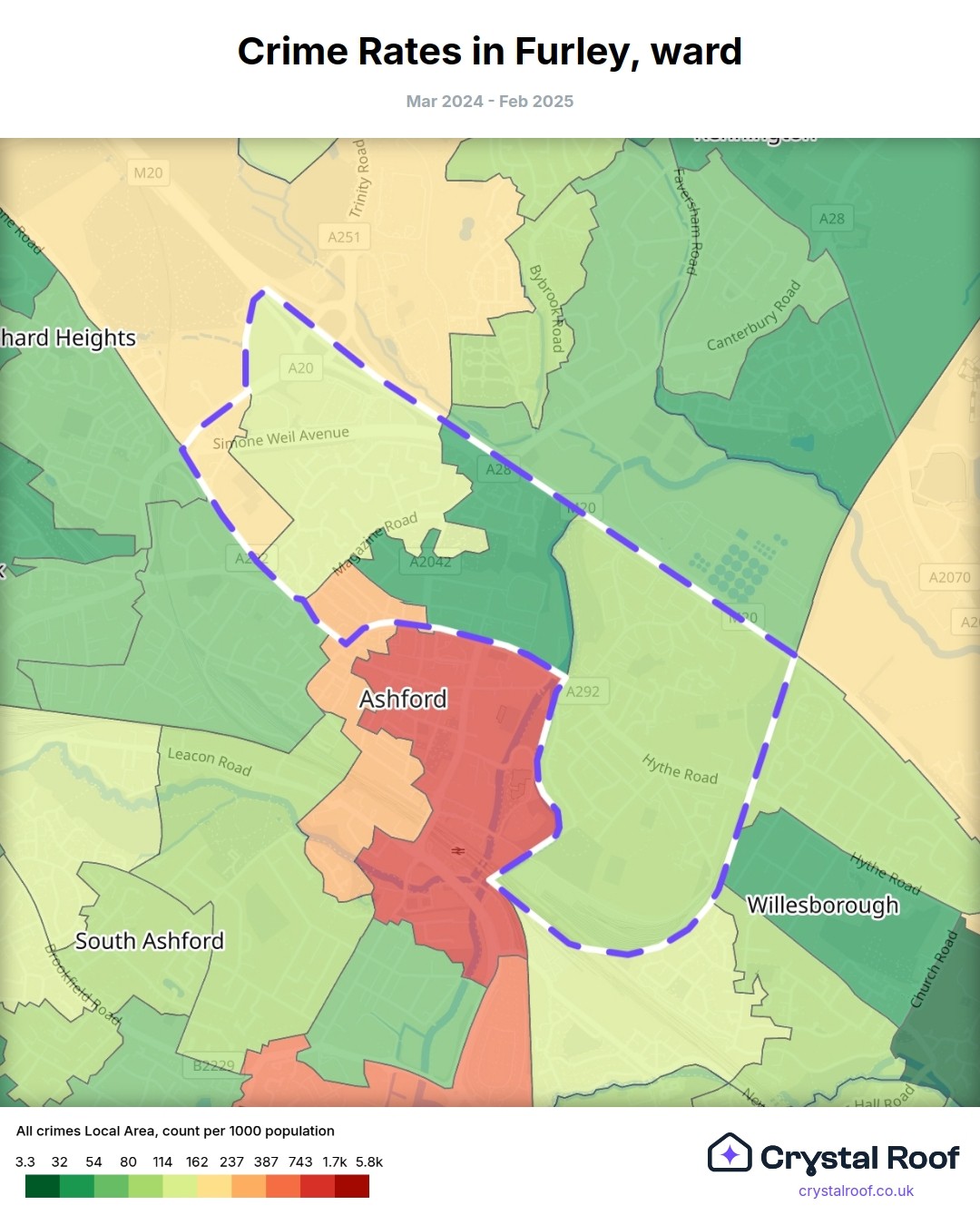 Furley (ward) is located within Ashford (borough). Annual total crime rate in Ashford (borough) is 82.8 crimes per thousand resident population, which can be rated as 3 out of 10 or low crime level compared to other local authority districts in England and Wales.