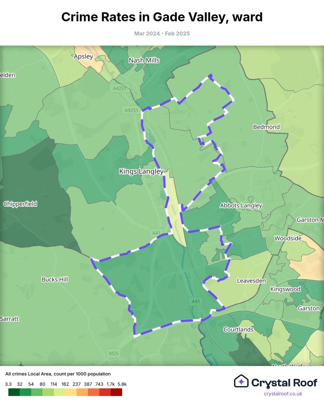 Gade Valley (ward) is located within Three Rivers (borough). Annual total crime rate in Three Rivers (borough) is 68.4 crimes per thousand resident population, which can be rated as 2 out of 10 or low crime level compared to other local authority districts in England and Wales.