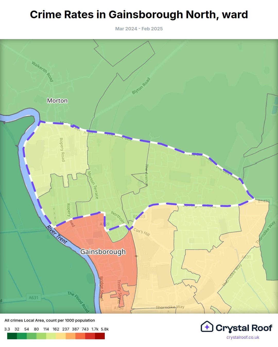 Gainsborough North, (ward) includes areas with the following crime ratings (see map):