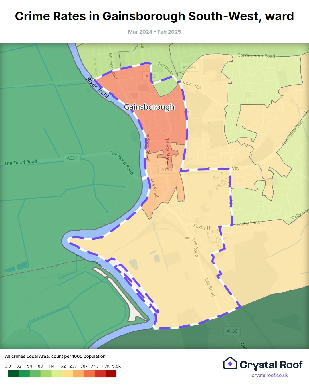 Gainsborough South-West, (ward) includes areas with the following crime ratings (see map):