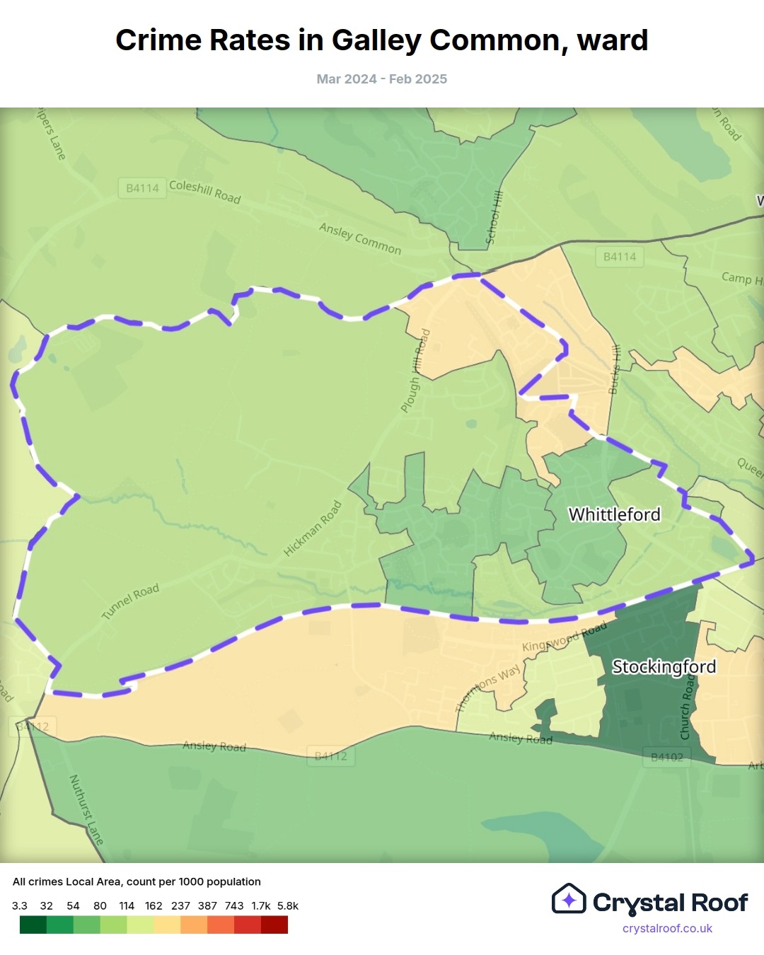 Galley Common, (ward) includes areas with the following crime ratings (see map):