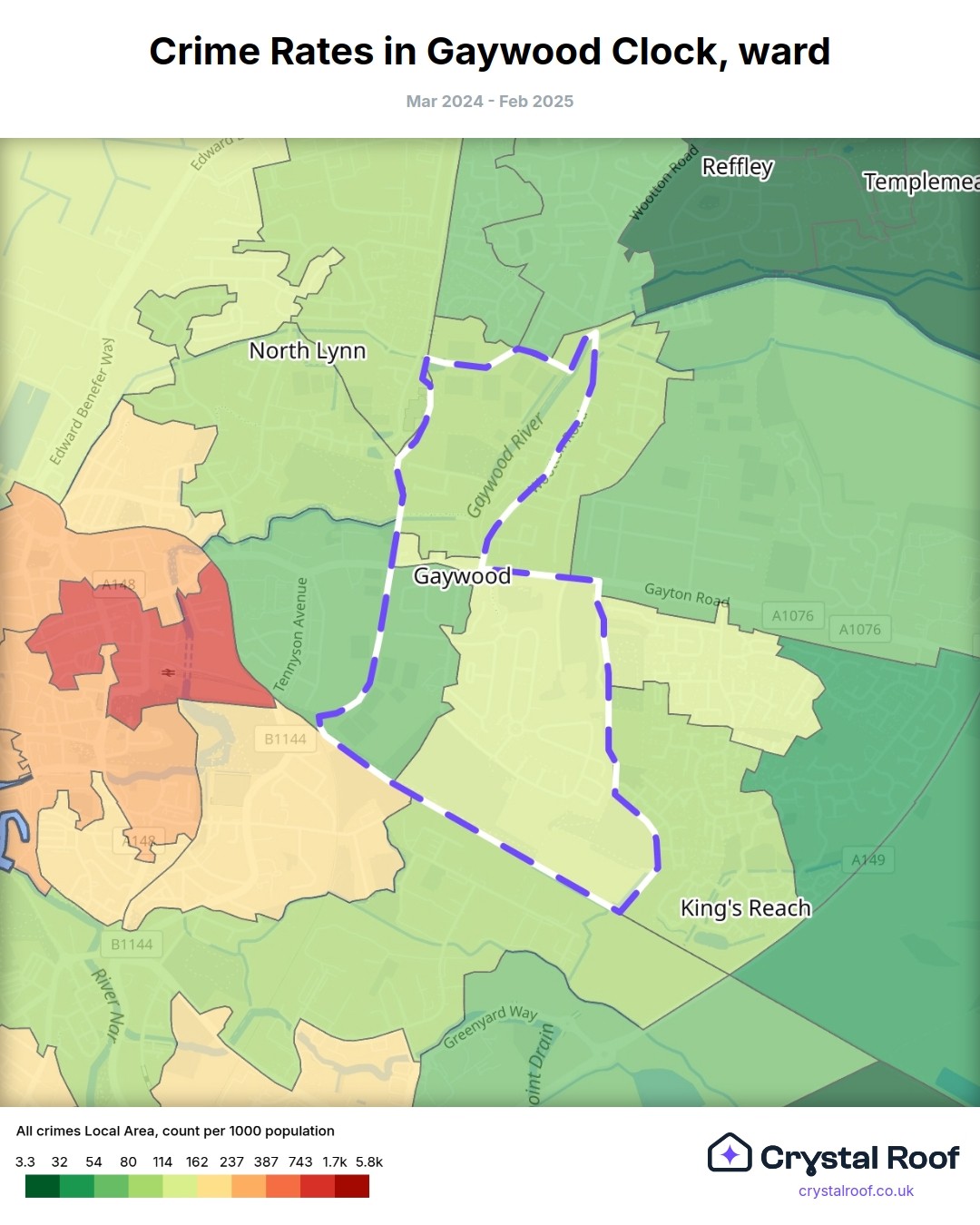 Gaywood Clock, (ward) includes areas with the following crime ratings (see map):