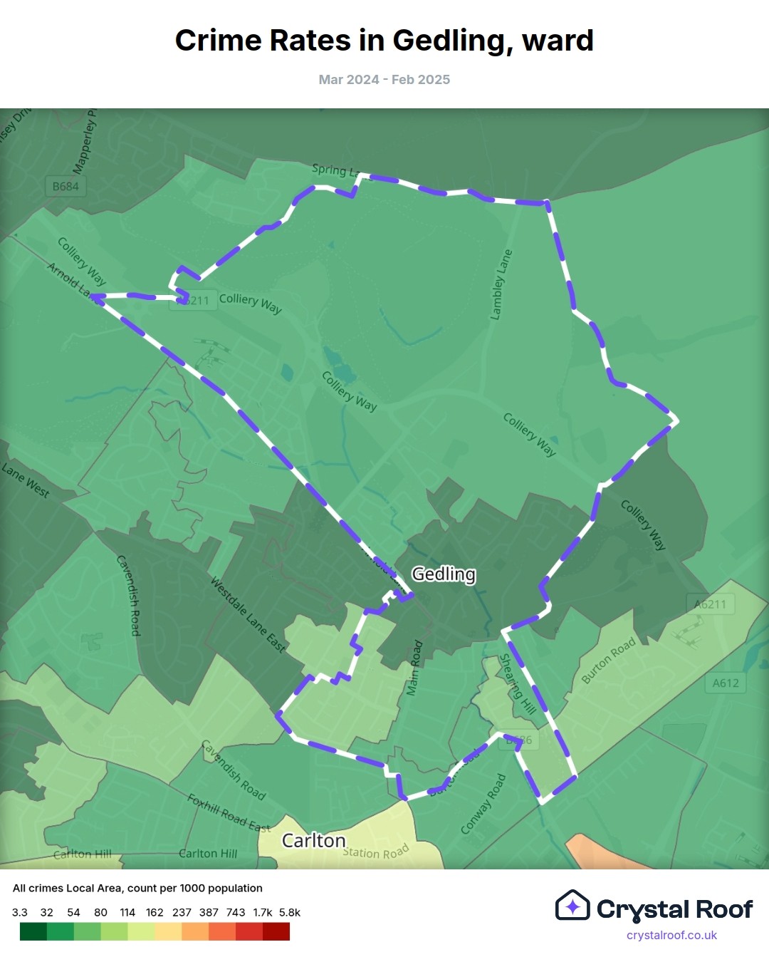 Gedling, (ward) includes areas with the following crime ratings (see map):