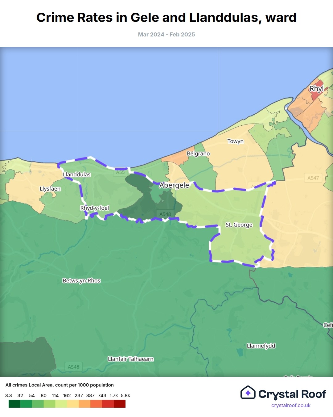 Gele and Llanddulas, (ward) includes areas with the following crime ratings (see map):