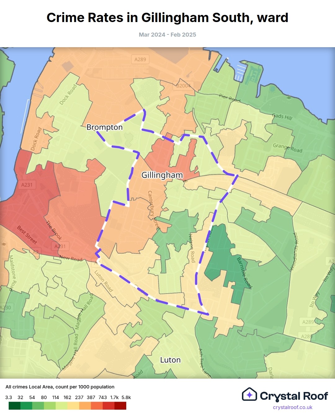 Gillingham South, (ward) includes areas with the following crime ratings (see map):