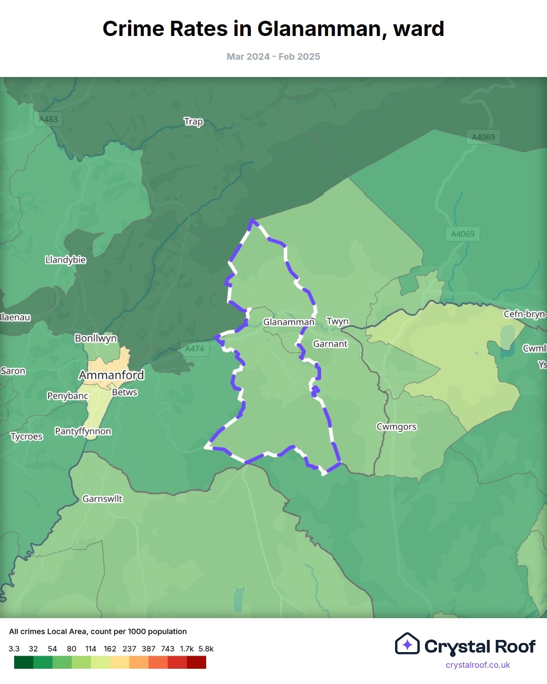 Glanamman (ward) is located within Carmarthenshire (borough). Annual total crime rate in Carmarthenshire (borough) is 77.8 crimes per thousand resident population, which can be rated as 3 out of 10 or low crime level compared to other local authority districts in England and Wales.