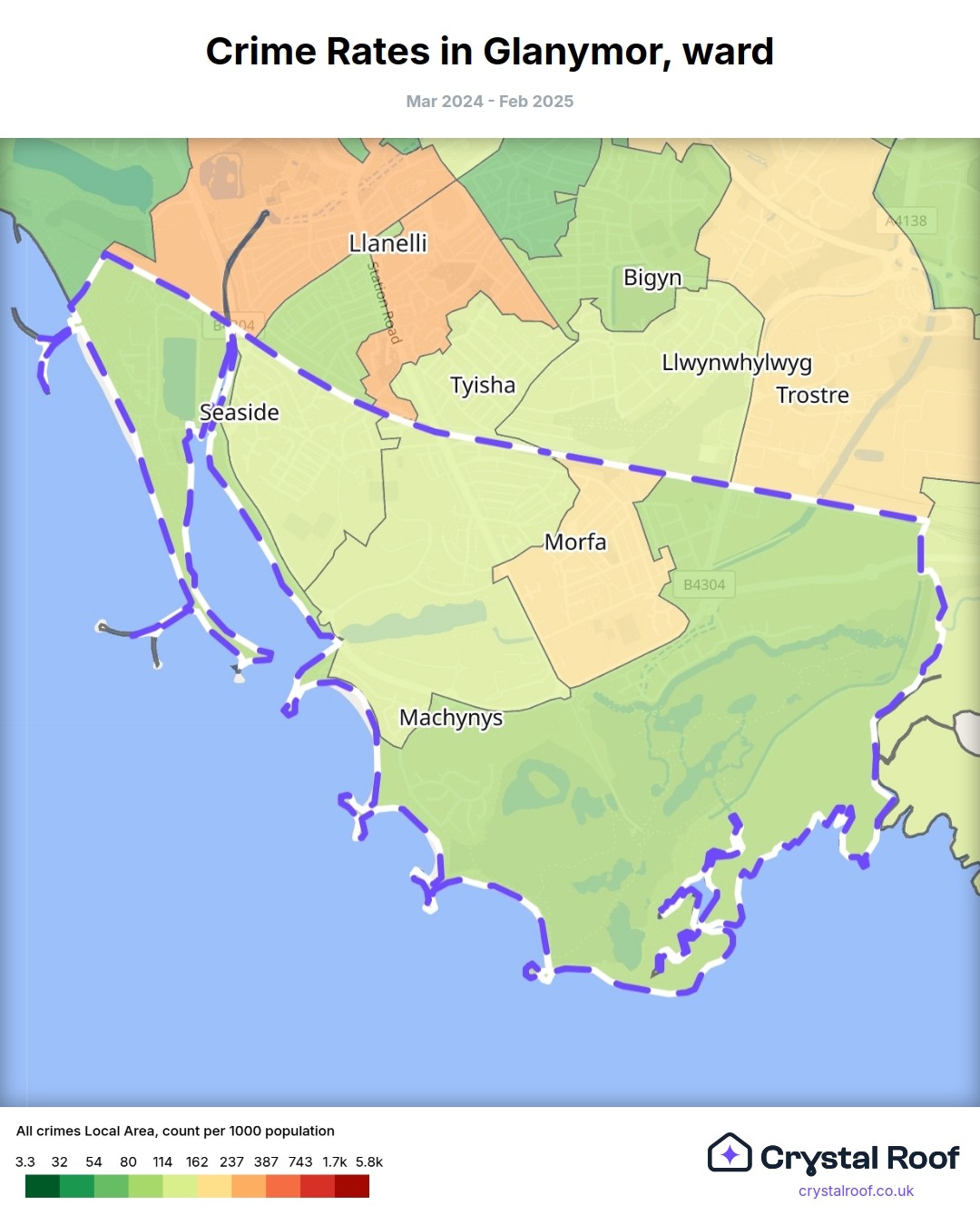 Glanymor, (ward) includes areas with the following crime ratings (see map):
