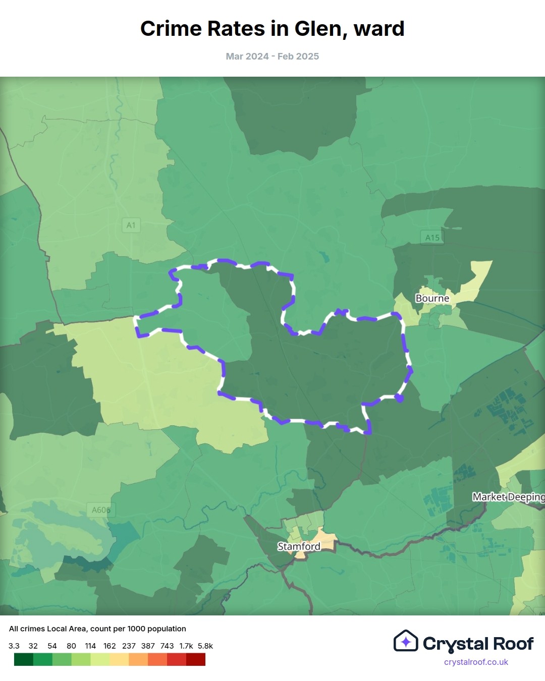 Glen (ward) is located within South Kesteven (borough). Annual total crime rate in South Kesteven (borough) is 70.9 crimes per thousand resident population, which can be rated as 2 out of 10 or low crime level compared to other local authority districts in England and Wales.