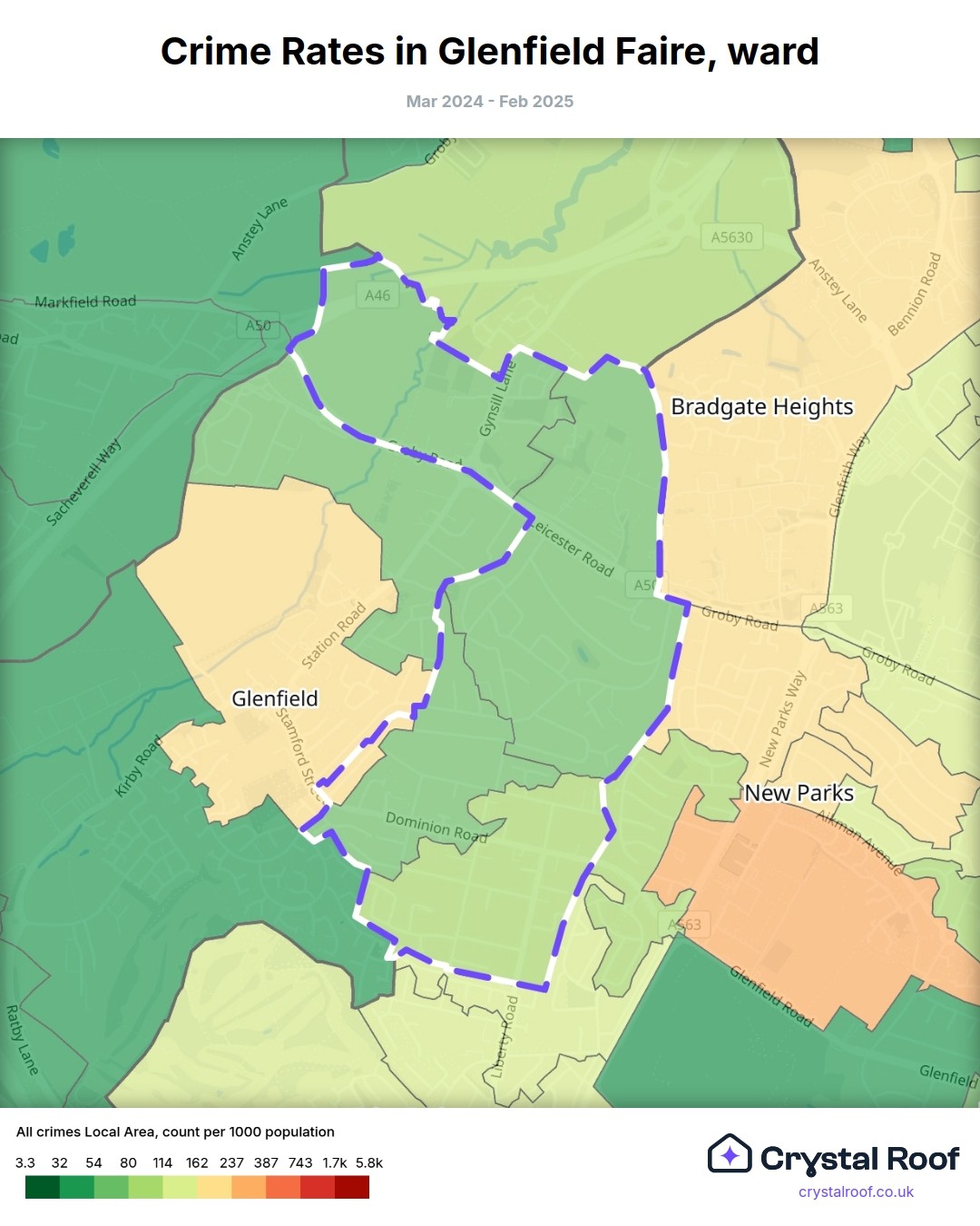Glenfield Faire, (ward) includes areas with the following crime ratings (see map):