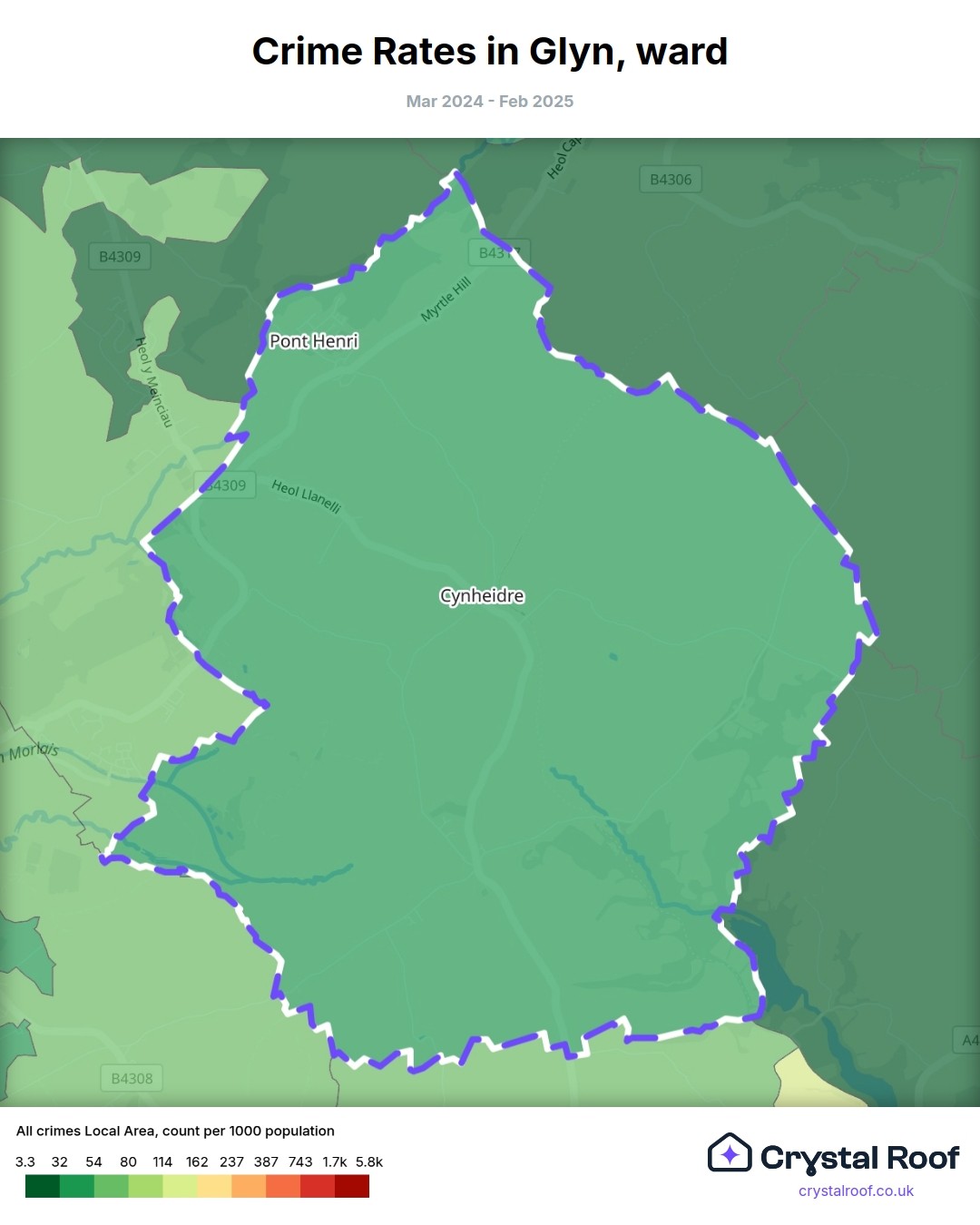 Glyn (ward) is located within Carmarthenshire (borough). Annual total crime rate in Carmarthenshire (borough) is 77.8 crimes per thousand resident population, which can be rated as 3 out of 10 or low crime level compared to other local authority districts in England and Wales.
