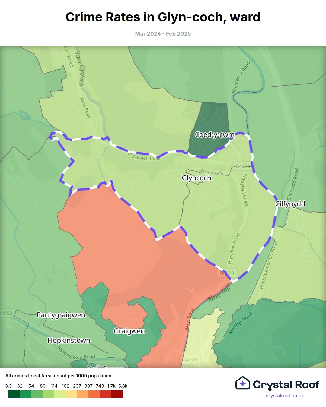 Glyn-coch, (ward) includes areas with the following crime ratings (see map):