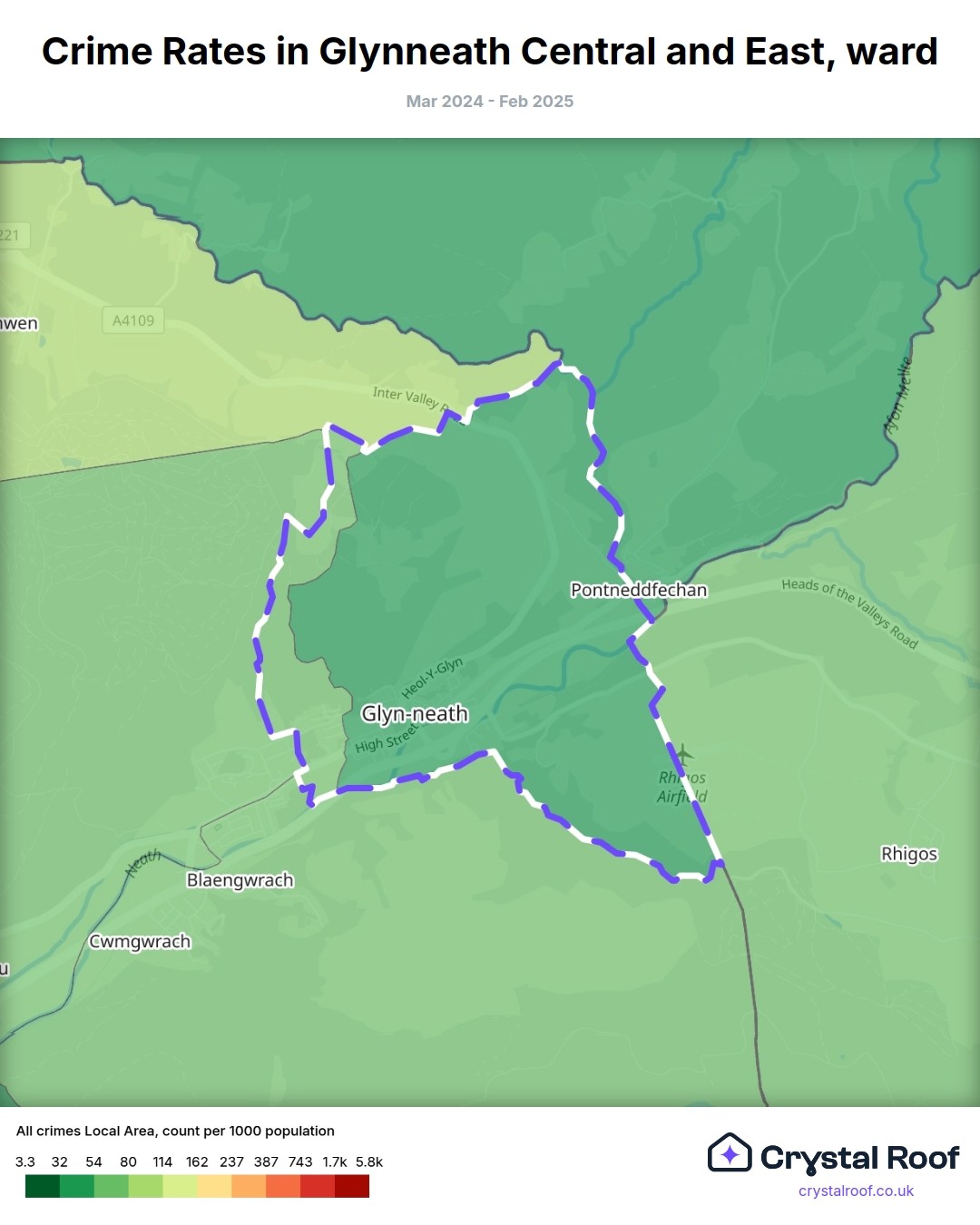 Glynneath Central and East, (ward) includes areas with the following crime ratings (see map):