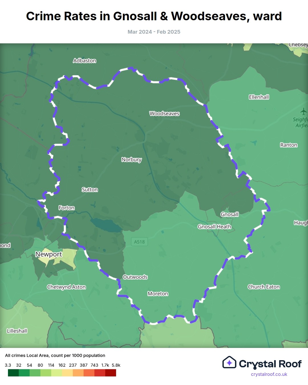 The figures in grey indicate the relative ratings of Gnosall & Woodseaves (ward) for a specific crime type compared to other wards in England and Wales.