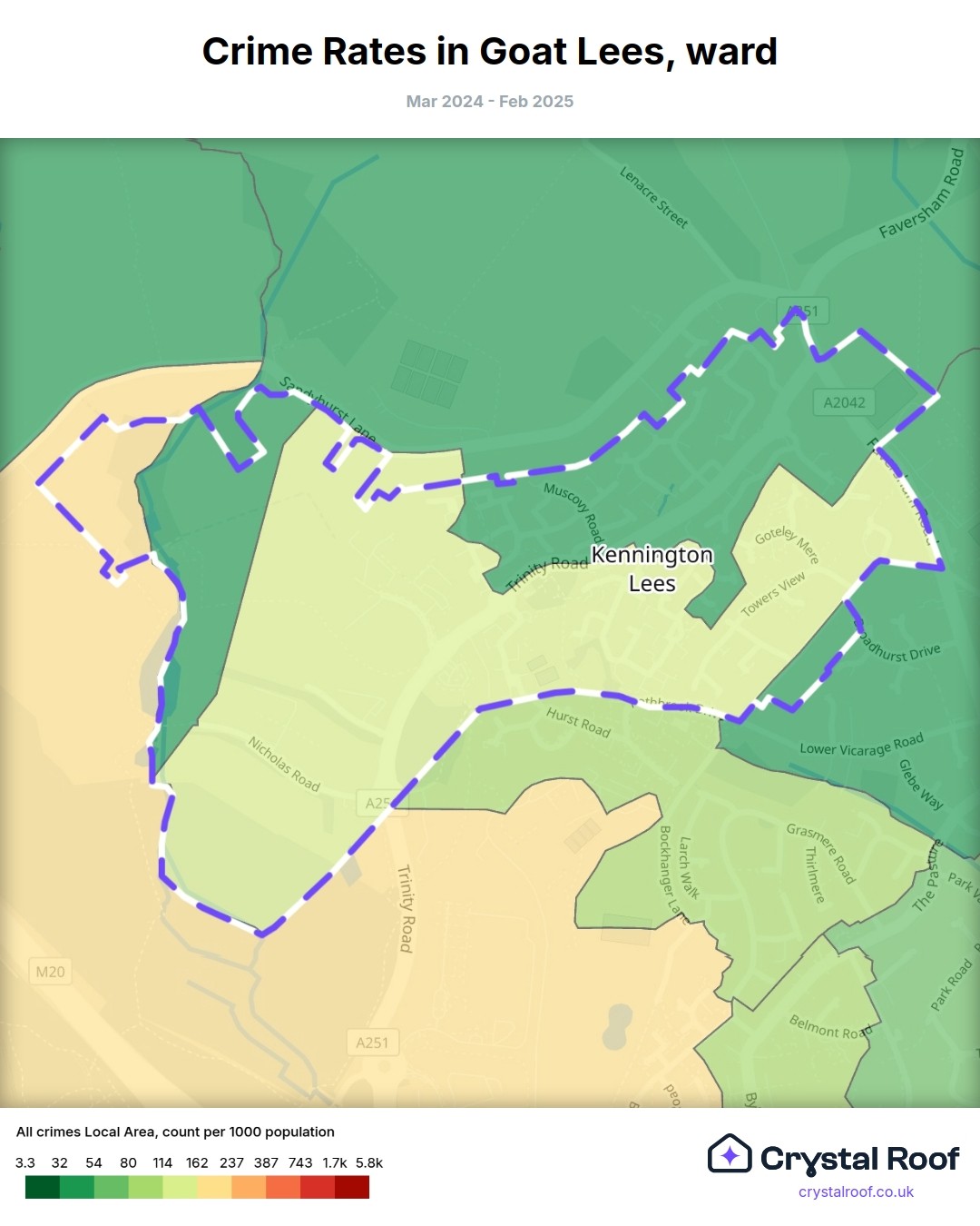 Goat Lees (ward) is located within Ashford (borough). Annual total crime rate in Ashford (borough) is 82.8 crimes per thousand resident population, which can be rated as 3 out of 10 or low crime level compared to other local authority districts in England and Wales.