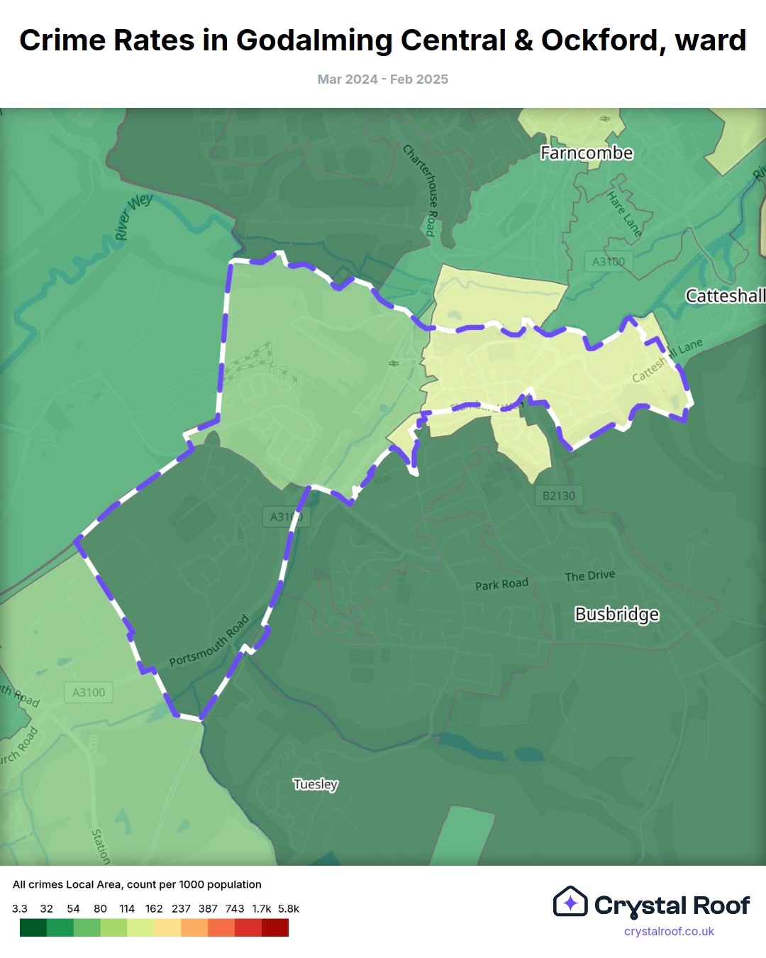 Godalming Central & Ockford, (ward) includes areas with the following crime ratings (see map):