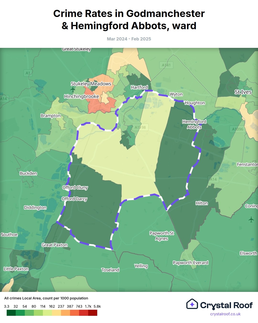 Godmanchester & Hemingford Abbots, (ward) includes areas with the following crime ratings (see map):