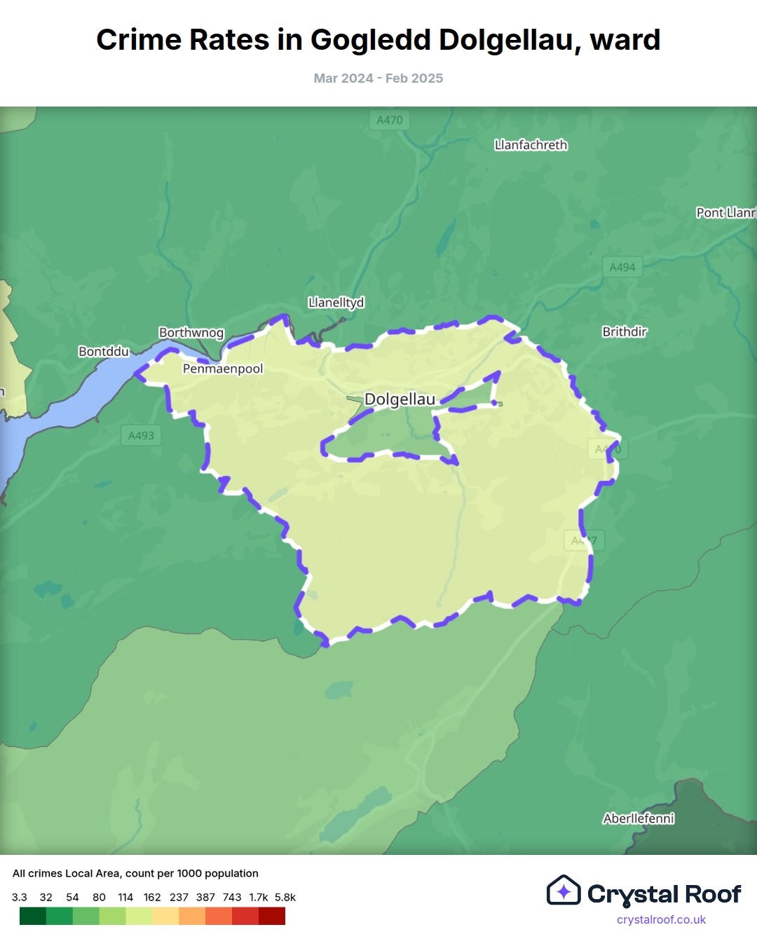 Gogledd Dolgellau, (ward) includes areas with the following crime ratings (see map):