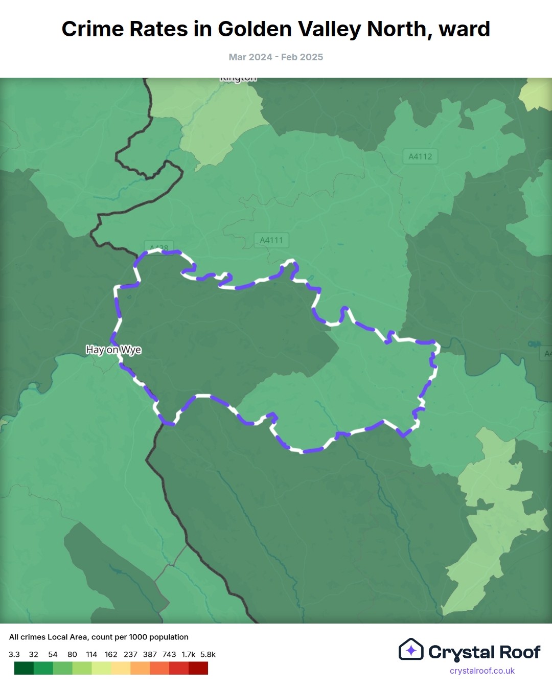 Golden Valley North (ward) is located within Herefordshire, County of (borough). Annual total crime rate in Herefordshire, County of (borough) is 63.5 crimes per thousand resident population, which can be rated as 2 out of 10 or low crime level compared to other local authority districts in England and Wales.