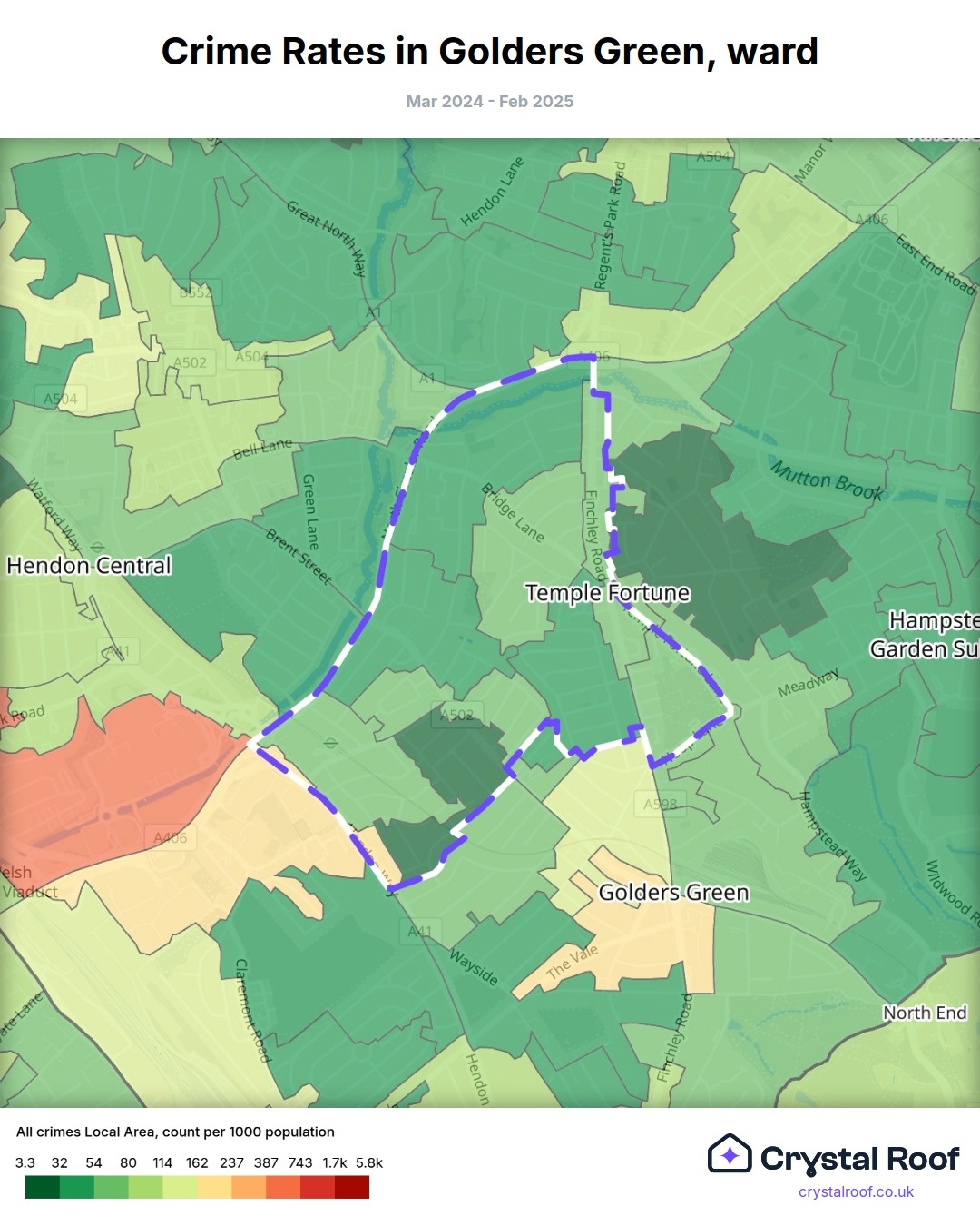 Golders Green, (ward) includes areas with the following crime ratings (see map):