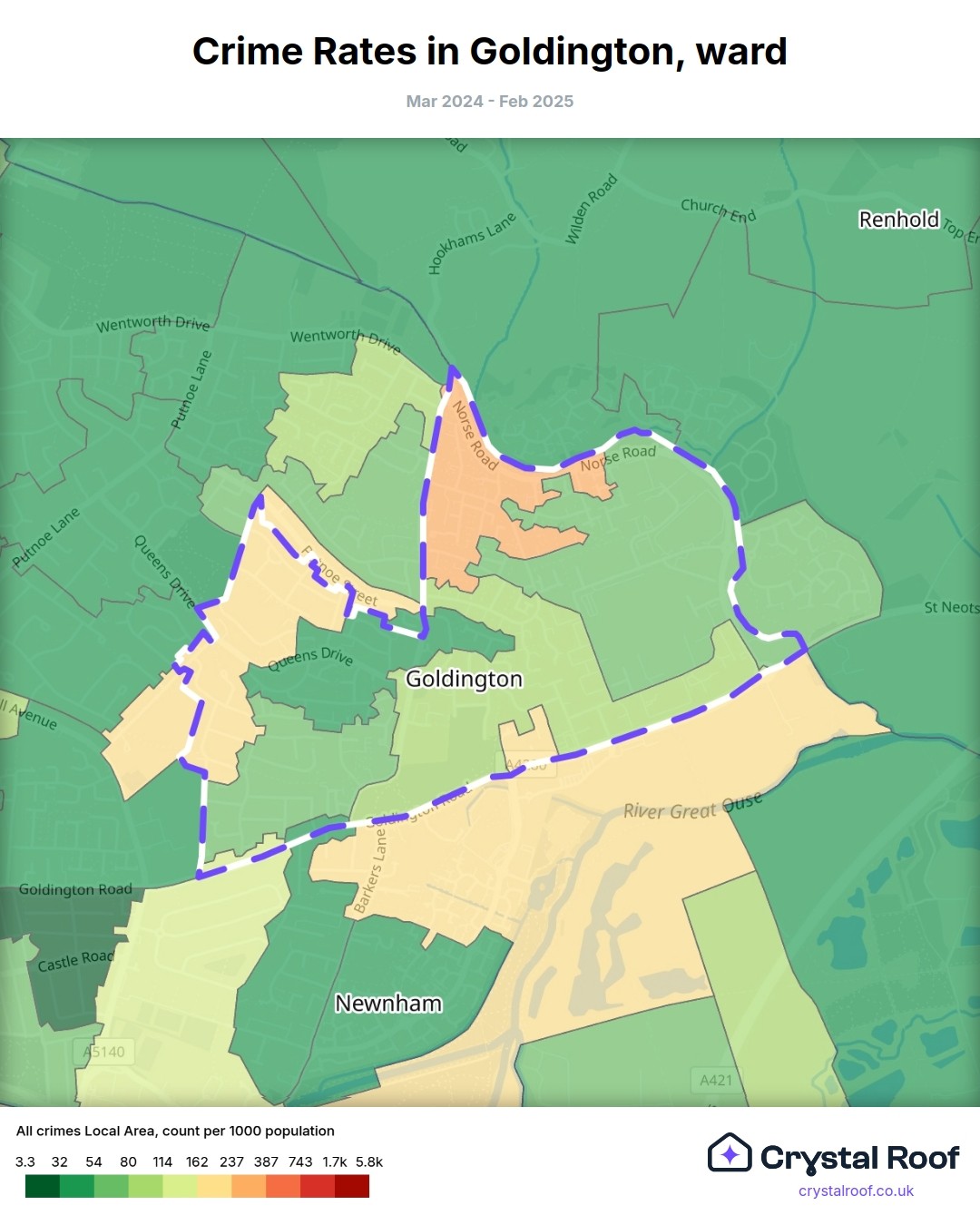 Goldington, (ward) includes areas with the following crime ratings (see map):