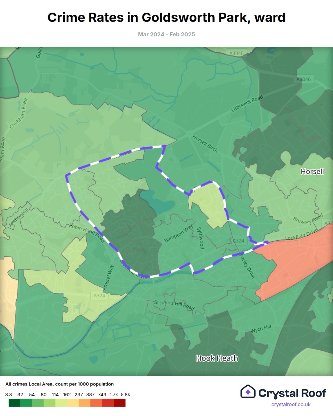 Goldsworth Park, (ward) includes areas with the following crime ratings (see map):